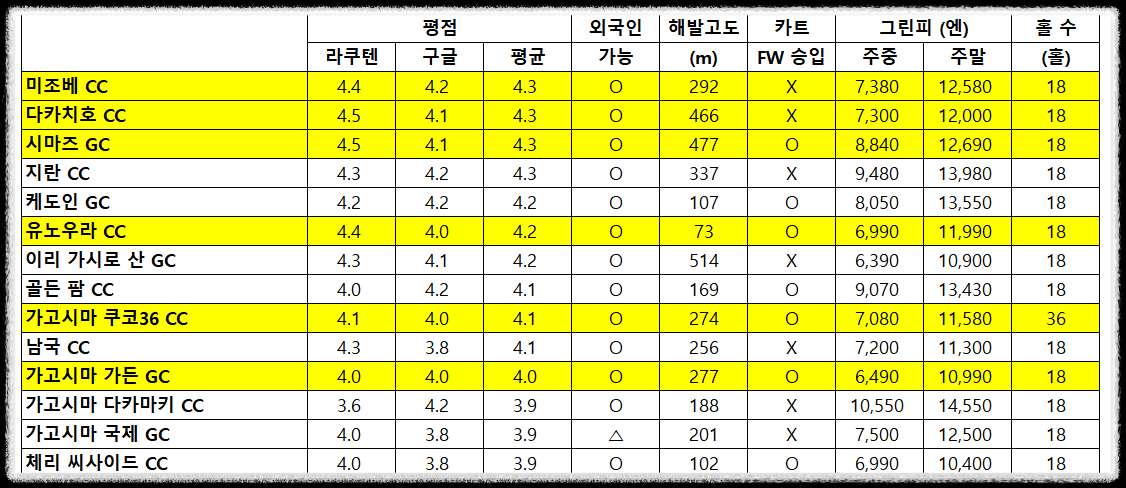 특히 시마즈 GC나 가고시마 쿠코36 CC처럼 평점이 유지되거나 상승한 곳은 컨디션 면에서 신뢰도가 높다고 느껴졌어요.