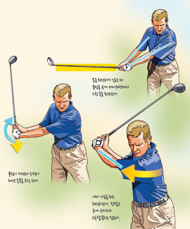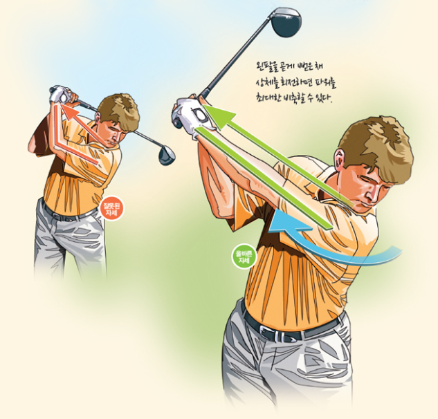 백스윙을 크게 만들려고 팔로 들어 올리면 궤도가 흔들리기 쉬워요.